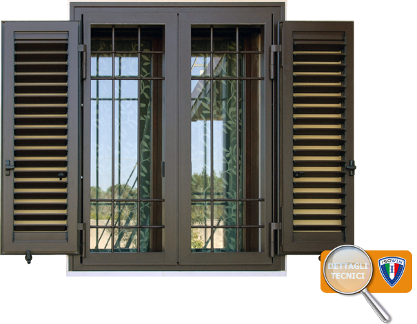 Realizzata con telaio, anta apribile ed elementi decorativi con profilati di acciaio zincati e sottoposta alla successiva verniciatura a fuoco, è corredata da una persiana in alluminio a lamelle orientabili, fisse, chiuse o dallo scuro a doghe verticali o alro. La verniciatura con le stesse polveri di entrambe le strutture rende la grata-persiana COMBINATA esteticamnete uniforme ed elegante. La sicurezza è garantita dall'appilcazione di serrature multipunto e di rostri antistrappo montati in prossimità delle cerniere.